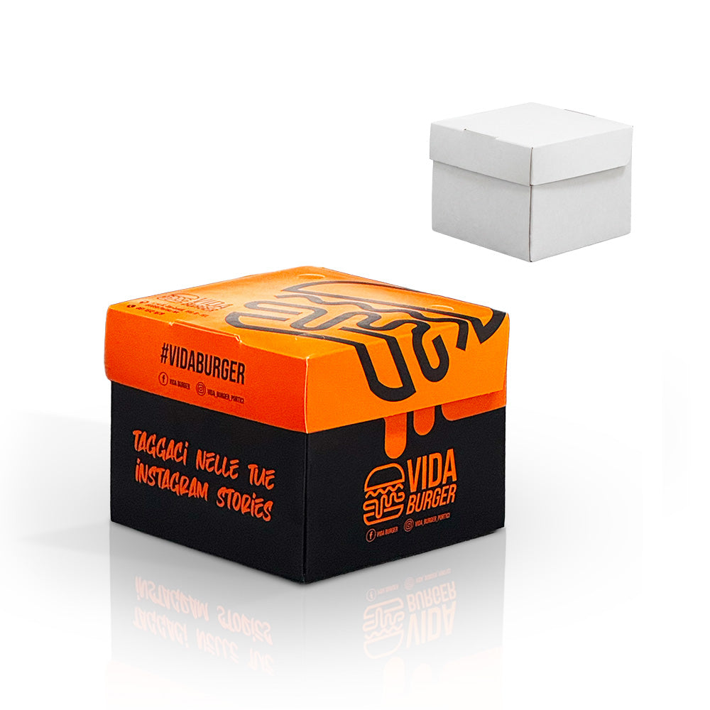 Valorizza il tuo servizio di asporto e delivery con la nostra scatola per hamburger personalizzabile. Progettata per mantenere intatta la qualità e la temperatura dei tuoi prodotti, questa confezione unisce praticità a un eccellente impatto visivo per la promozione del tuo brand.