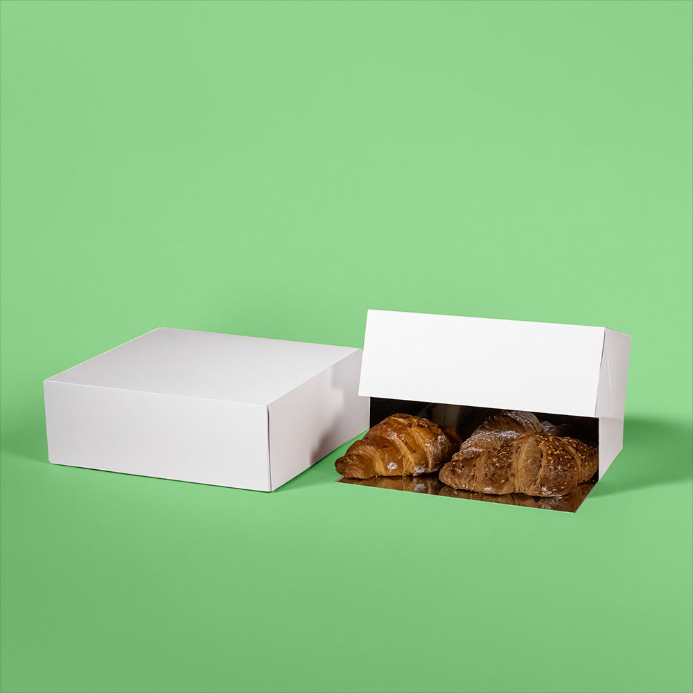La scatola modello Cadré rappresenta la soluzione più elegante e pratica per il confezionamento di paste fresche, mignon e dolci da guantiera. La sua struttura unica permette un'apertura facilitata che trasforma la scatola in un vassoio da portata.